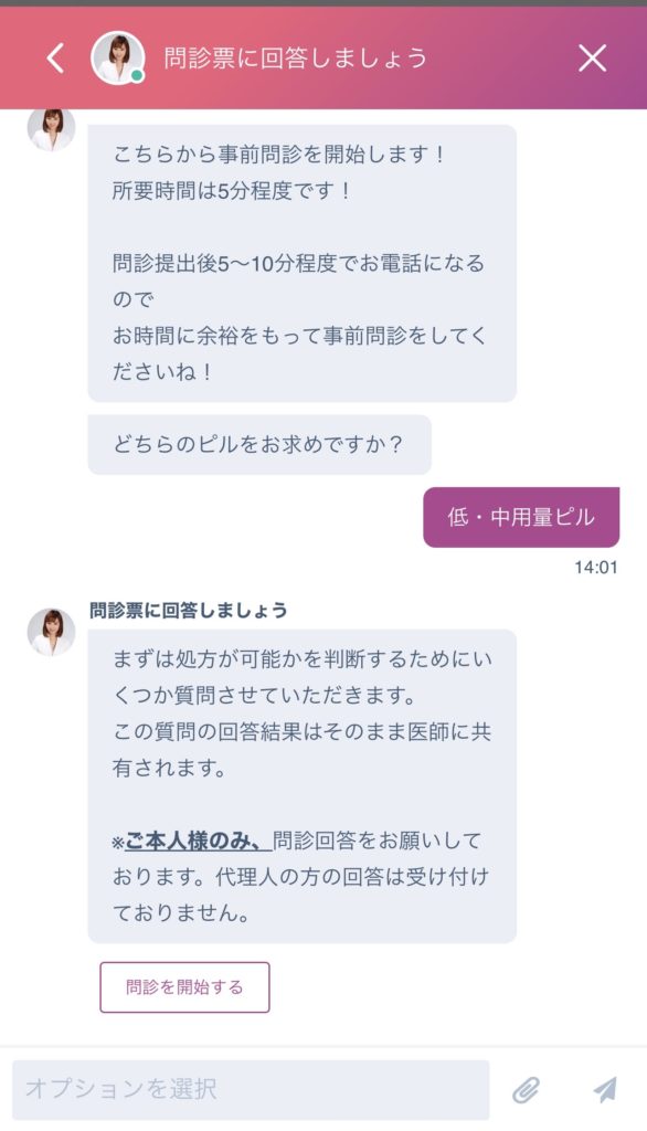 個人情報入力したら自動チャット形式の問診が始まります♪あなたが欲しいピルの種類や状況について20問程度答えましょう♪(5分程度)